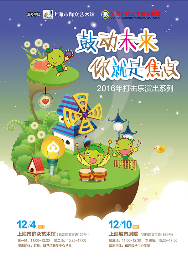 终于来到年末时刻, 这群音乐少年将再度站上击乐的舞台。 用双手, 尽情在鼓面游走欢腾, 用鼓棒, 肆意击打出乐器多元性格, 用琴锤, 击荡出每一寸琴键的饱满与愉悦, 鼓动未来, 你, 就是焦点! 音乐会信息 12/4 周日 上海市群众艺术馆(古宜路125号) 第一场:11:00-12:30 第二场:15:30-17:00 演出团体:虹桥、群艺馆教学中心学员 12/10 周六 上海城市剧院(都市路4889号) 第一场:11:00-12:30 第二场:15:30-17:00 演出团体:东艺教学中心学员