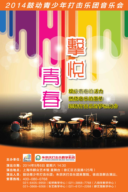 一群由群艺馆及东艺专修班升至杰优班的击乐青少年,将于今年9月初开启鼓动青少年打击乐团元年。因为对打击乐的热爱,这些击乐少年虽然正值课业压力沉重的年纪,仍利用课余闲睱勤于练习。他们秉持着对音乐的热情,以鼓棒与琴槌成就自己的青春世代;除了不断精进演奏技巧外,更挥洒出属于年轻人的无穷创意,让人充分感受到年轻的无限希望!此次演出,朱宗庆打击乐一团团员吴慧甄、徐启浩老师亲自选曲,编排,携活力四射的鼓动青少年打击乐团于上海市群众艺术馆星舞台为观众奉上一场“击悦青春”打击乐音乐会,各位喜爱打击乐的观众们尽请期待!
