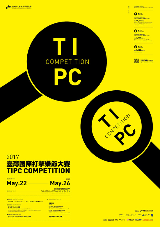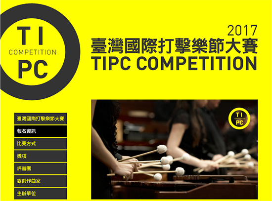 与众不同的TIPC, 注重文化交流, 邀请全球最顶尖打击乐团莅临台湾, 所有演出者必须参与其他团体演出, 所有打击乐团必须演奏一首台湾作曲家作品。 以上,都成为TIPC的独特标签。 随后在世界各地,陆续有新的打击乐节相继诞生, 例如2000年创办的北京国际打击乐节, 2002年创办的加拿大朗基尔国际打击乐节 2010年创办的首尔国际打击乐节 及中国国家大剧院国际打击乐节, 2012美国北卡罗莱纳州创办的Asheville Percussion Festival等等。 2017年,首届「台湾国际打击乐节大赛」 将与第九届TIPC同时举行, 大赛将延伸台湾国际打击乐节之精神, 提供国际规格之权威性平台, 聘请一流打击乐艺术家担任评审, 发掘顶尖打击乐新秀, 并邀请各国知名打击乐团 与打击乐大师举办多场演奏会与讲座, 推动国际打击乐交流。 此外,为扶植新生代打击乐人才, 本次大赛的优胜者将于国家音乐厅, 与众击乐大师共同举办一场音乐会, 让世界看见打击乐新星的无穷潜力。 大赛信息 大赛时间:2017.5.22-5.26 大赛地点:台北艺术大学 报名资格:不限国籍均可报名参赛 年龄限制: 木琴独奏组:1981年1月1日~2004年1月1日 四重奏组:四位参赛者年龄相加不得超过140岁 报名方式:将报名表及音频档寄至官方邮箱 (报名表及邮箱见文章末尾处) 报名时间:2016.9.1-2017.1.31 报名费用:新台币10000元整 木琴独奏组比赛时间:2017.5.22-5.26 四重奏组比赛时间:2017.5.24-5.26 首届TIPC大赛 强大评审阵容